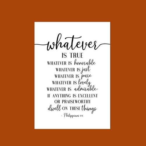 Finally, brothers, whatever is true, whatever is honorable, whatever is just, whatever is pure, whatever is lovely, whatever is commendable, if there is any excellence, if there is anything worthy of praise, think about these things. Philippians 4:8