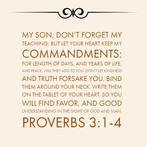My son, do not forget my teaching, but let your heart keep my commandments, for length of days and years of life and peace they will add to you. Let not steadfast love and faithfulness forsake you; bind them around your neck; write them on the tablet of your heart. So you will find favor and good success in the sight of God and man.. Proverbs 3:1-4