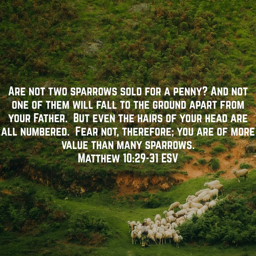 "Are not two sparrows sold for a penny? Yet not one of them will fall to the ground outside your Father’s care… Even the very hairs of your head are all numbered. So don’t be afraid; you are worth more than many sparrows."