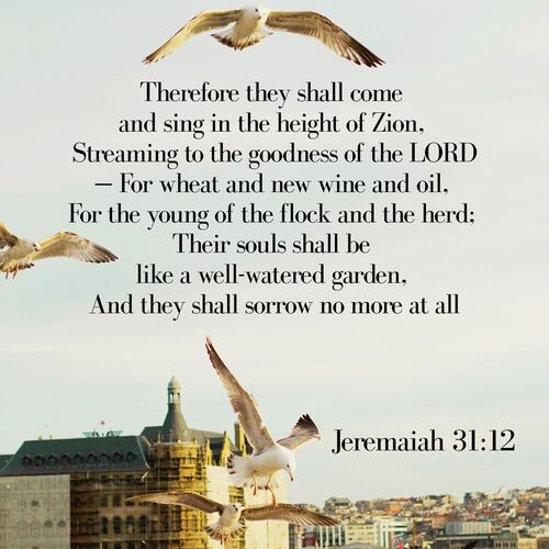 “They shall come and sing in the height of Zion, streaming to the goodness of the Lord… Their souls shall be like a well-watered garden, and they shall sorrow no more at all.”Jeremiah 31:12