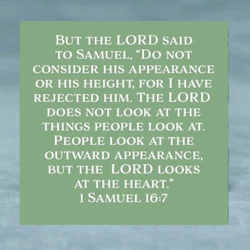 But the Lord said to Samuel, “Do not look on his appearance or on the height of his stature, because I have rejected him. For the Lord sees not as man sees: man looks on the outward appearance, but the Lord looks on the heart. 1 Samuel 16:7