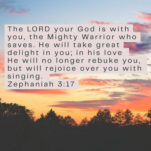 The LORD your God is with you, the Mighty Warrior who saves. He will take great delight in you; in his love he will no longer rebuke you, but will rejoice over you with singing.
